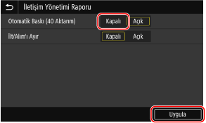 <Otomatik Baskı (40 Aktarım)> kısmında <Kapalı> ve <Uygula> öğelerini seçin.