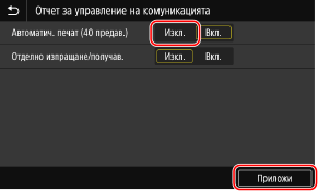 Изберете <Изкл.> в <Автоматич. печат (40 предав.)> и изберете <Приложи>.