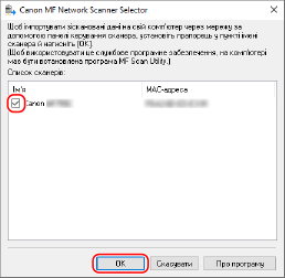 Підключаючи апарат до комп’ютера через бездротову або дротову локальну мережу, зареєструйте апарат у розділі «MF Network Scanner Selector».