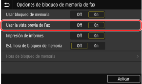 Seleccione <On> en <Usar la vista previa de Fax>.