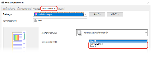 ในแท็บ [แหล่งจ่ายกระดาษ] ให้เลือกแหล่งกระดาษที่ใส่กระดาษที่พิมพ์ไว้แล้วใน [แหล่งจ่ายกระดาษ]