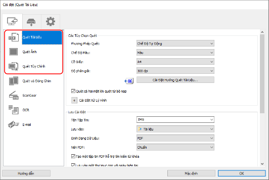 Nếu bạn đã chọn [PDF (Chia thành các Tập Tin Một Trang)] hoặc [PDF], bạn có thể đặt tỷ lệ nén với [Nén PDF]. Đối với Windows, nếu bạn đã chọn [Tạo một tập tin PDF hỗ trợ tìm kiếm từ khóa], các ký tự trong ảnh được chuyển đổi thành dữ liệu văn bản và được lưu thành tập tin PDF cho phép tìm kiếm từ khóa.