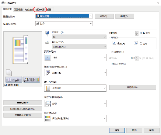 在打印机驱动程序的打印设置窗口中单击 [纸张来源]。
