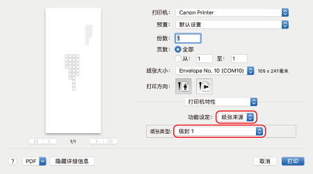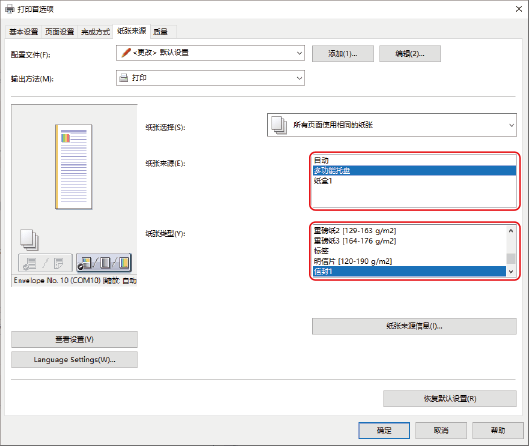 在 [纸张来源] 中选择装入信封的纸张来源,然后在 [纸张类型] 中选择 [信封]。