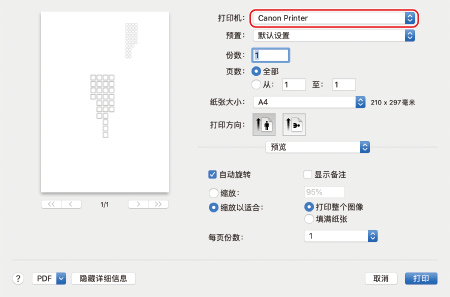 在打印窗口中选择本机,然后单击 [首选项]、[打印机属性] 或 [属性]。