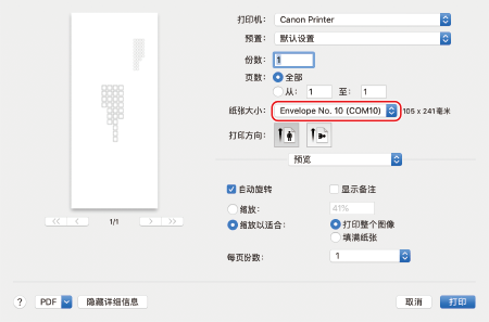 在 [纸张大小] 中选择装入信封的纸张尺寸。