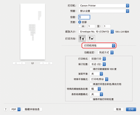 从打印选项弹出菜单中,选择 [打印机特性]。