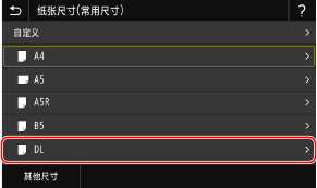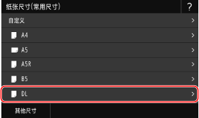 将信封装入多功能托盘中之后,显示屏上会出现用于选择纸张尺寸的设置画面。按照以下步骤指定设置。
