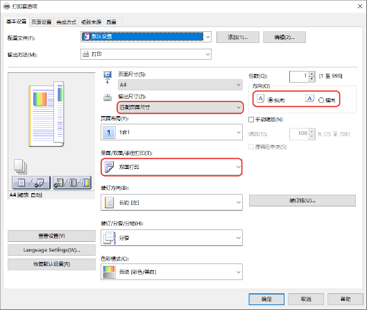 在 [基本设置] 选项卡中,指定纸张尺寸、打印方向和打印面。