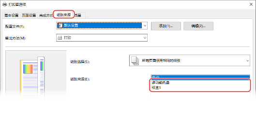 在 [纸张来源] 选项卡中,在 [纸张来源] 中选择装入预打印纸张的纸张来源。