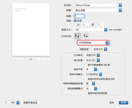 从打印选项弹出菜单中,选择 [打印机特性]。