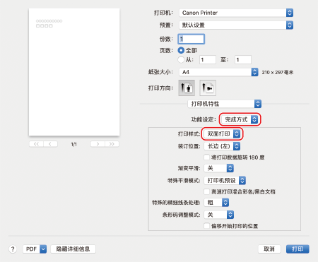 在 [功能设定] 中选择 [完成方式],然后在 [打印样式] 中选择 [单面打印] 或 [双面打印]。