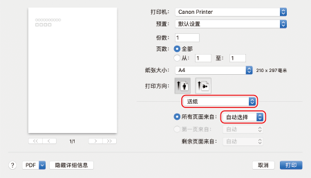 从打印选项弹出菜单中选择 [Paper Feed],然后从 [All Pages From] 弹出菜单中选择装入预打印纸张的纸张来源。
