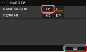 在 <自动打印(传输40次后)> 中选择 <关闭>,然后选择 <应用>。