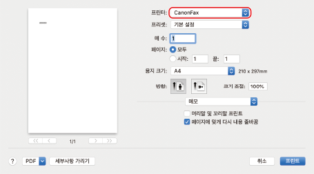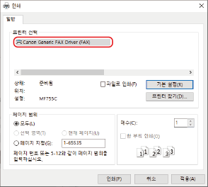 인쇄 화면에서 기기의 팩스 드라이버를 선택합니다.