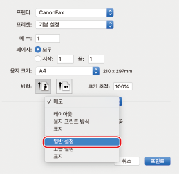 인쇄 대화 상자의 팝업 메뉴에서 [일반 설정] 패널을 선택합니다.