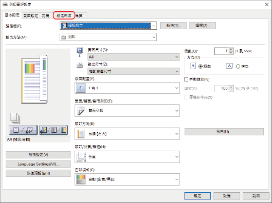 在印表機驅動程式的列印設定視窗中,按一下 [紙張來源]。