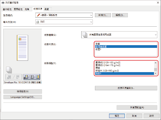 在 [紙張來源] 內選擇裝入信封的紙張來源,然後在 [紙張類型] 內選擇 [信封]。