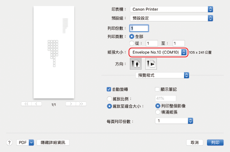 在 [紙張大小] 中選擇裝入信封的紙張尺寸。
