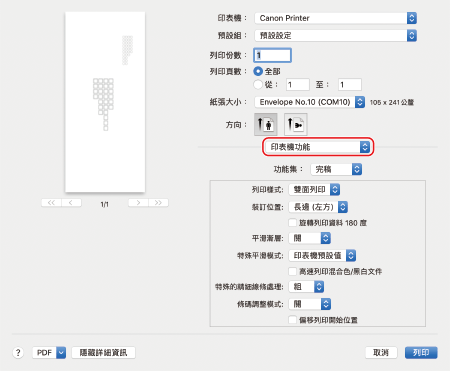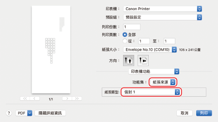 在 [功能集] 中選擇 [紙張來源],然後在 [紙張類型] 中選擇 [信封 1] 或 [信封 2]。