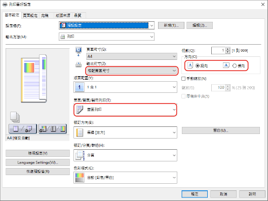在 [基本設定] 標籤內指定紙張尺寸、列印方向及列印面。
