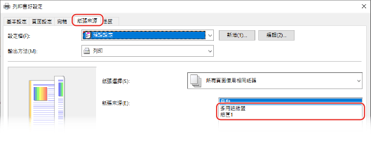 在 [紙張來源] 標籤中,於 [紙張來源] 內選擇裝入預列印紙的紙張來源。