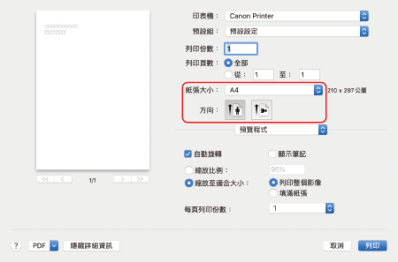 在 [紙張大小] 中選擇裝入的預列印紙的紙張尺寸,然後根據原稿文件的方向在 [Orientation] 中選擇縱向或橫向。