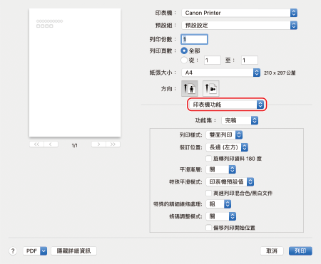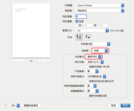 在 [功能集] 中選擇 [完稿],然後在 [列印樣式] 中選擇 [單面列印] 或 [雙面列印]。