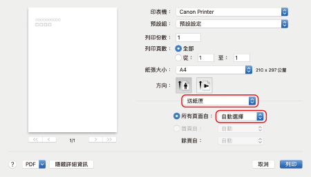 從列印選項快顯功能表中選擇 [Paper Feed],然後在 [All Pages From] 快顯功能表內選擇裝入預列印紙的紙張來源。