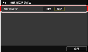若您想要在傳輸結果報表內附加一部分已傳送原稿,請於 <包含傳送影像> 選擇 <開啟>。