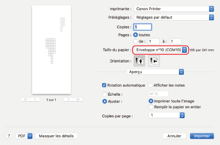 Sélectionnez le format du papier des enveloppes chargées dans [Taille du papier].