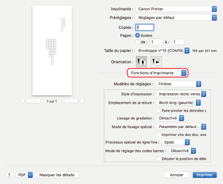 Dans le menu contextuel des options d'impression, sélectionnez [Fonctions d’imprimante].