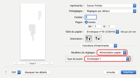 Sélectionnez la source de papier dans laquelle les enveloppes sont chargées [Alimentation papier], et sélectionnez [Enveloppe] dans [Type de papier ].