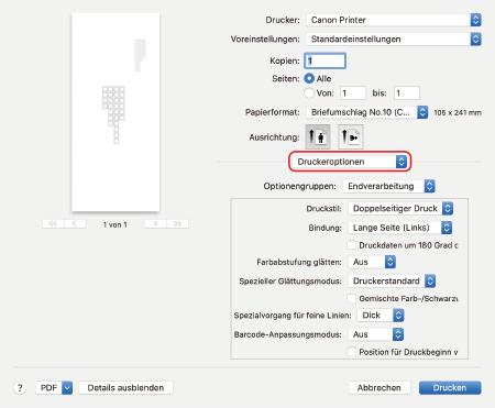 Wählen Sie im Popup-Menü der Druckoptionen die Option [Druckeroptionen].