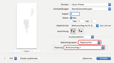 Wählen Sie [Papierzufuhr] unter [Optionengruppen], und wählen Sie dann [Briefumschlag 1] oder [Briefumschlag 2] unter [Papiertyp].