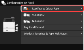 Os tamanhos de papel utilizados frequentemente estão predefinidos. Para permitir definir o tamanho do papel ao colocar o papel, siga estes passos.