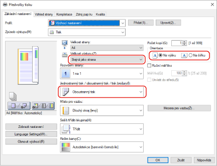 Na kartě [Základní nastavení] zadejte velikost papíru, orientaci tisku a tištěné strany.
