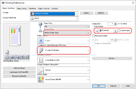 בכרטיסייה [Basic Settings] ציין את גודל הנייר, כיוון ההדפסה ואת צידי ההדפסה.