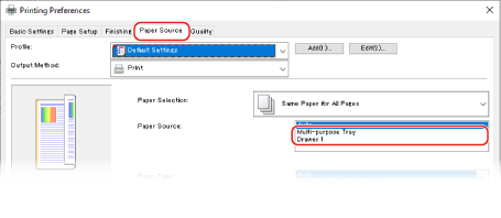 בכרטיסייה [Paper Source], בחר את מקור הנייר שבו הוטען הנייר המודפס מראש ב-[Paper Source].