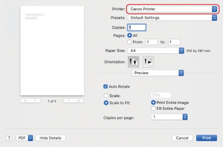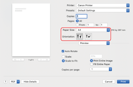 בחר את גודל הנייר הטעון והמודפס מראש ב [גודל הדף], ובחר באפשרות הדפסה לאורך או לרוחב [Orientation] בהתאמה לכיוון של מסמך המקור.
