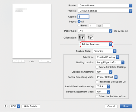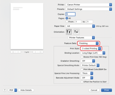 בחר [1-sided Printing] או [2-sided Printing] ב-[1-sided/2-sided/Booklet Printing].