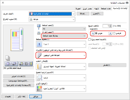 في علامة التبويب [الإعدادات الأساسية]، حدد حجم الورق والاتجاه المطبوع والأوجه المطبوعة.