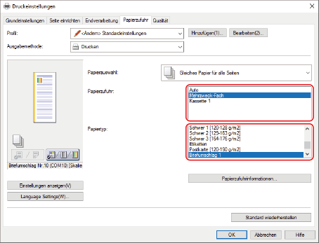 Wählen Sie in [Papierzufuhr] die Papierzufuhr aus, in die die Briefumschläge eingelegt wurden, und wählen Sie [Briefumschlag] in [Papiertyp] aus.