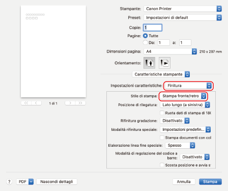 Selezionare [Finitura] in [Impostazioni caratteristiche], quindi selezionare [Stampa su un lato] o [Stampa fronte/retro] in [Stile di stampa].