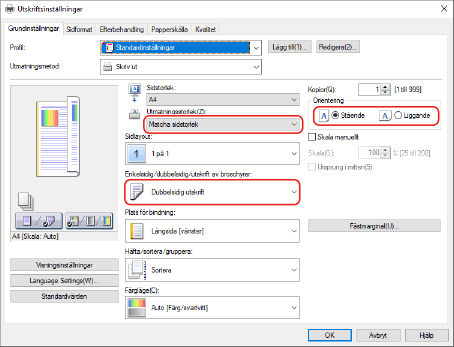 På fliken [Grundinställningar] anger du pappersformat, utskriftsorientering och vilka sidor som ska skrivas ut på.