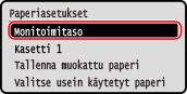 Jos lisättävää paperia täytyy vaihtaa usein, valitse asetukseksi <Vapaa>; se vähentää asetuksen muuttamiseen tarvittavien vaiheiden määrää. Huomaa kuitenkin, että tämä asetus antaa laitteen tulostaa, vaikka tulostinajurin paperityypin asetuksen ja laitteeseen lisätyn paperityypin välillä olisi ristiriita.