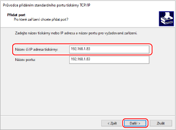 Zadejte IP adresu nebo název DNS zařízení a klikněte na tlačítko [Další].
