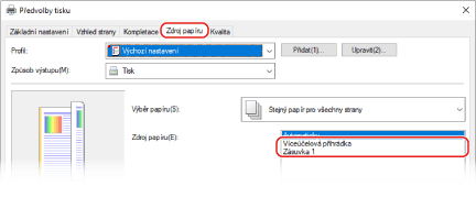 Na kartě [Zdroj papíru] vyberte zdroj papíru, do kterého byl vložen předtištěný papír [Zdroj papíru].