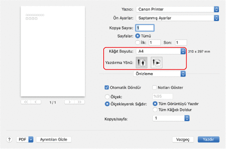 [Kâğıt Boyutu] kısmında önceden basılı kağıdın kağıt boyutunu ve [Orientation] kısmında orijinal belgenin yönüne göre dikey veya yatay yönü seçin.