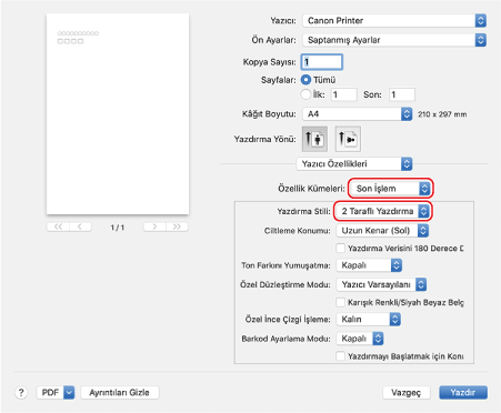 [Özellik Kümeleri] kısmında [Son İşlem] öğesini ve ardından [Yazdırma Stili] kısmında [1 Taraflı Yazdırma] veya [2 Taraflı Yazdırma] öğesini seçin.